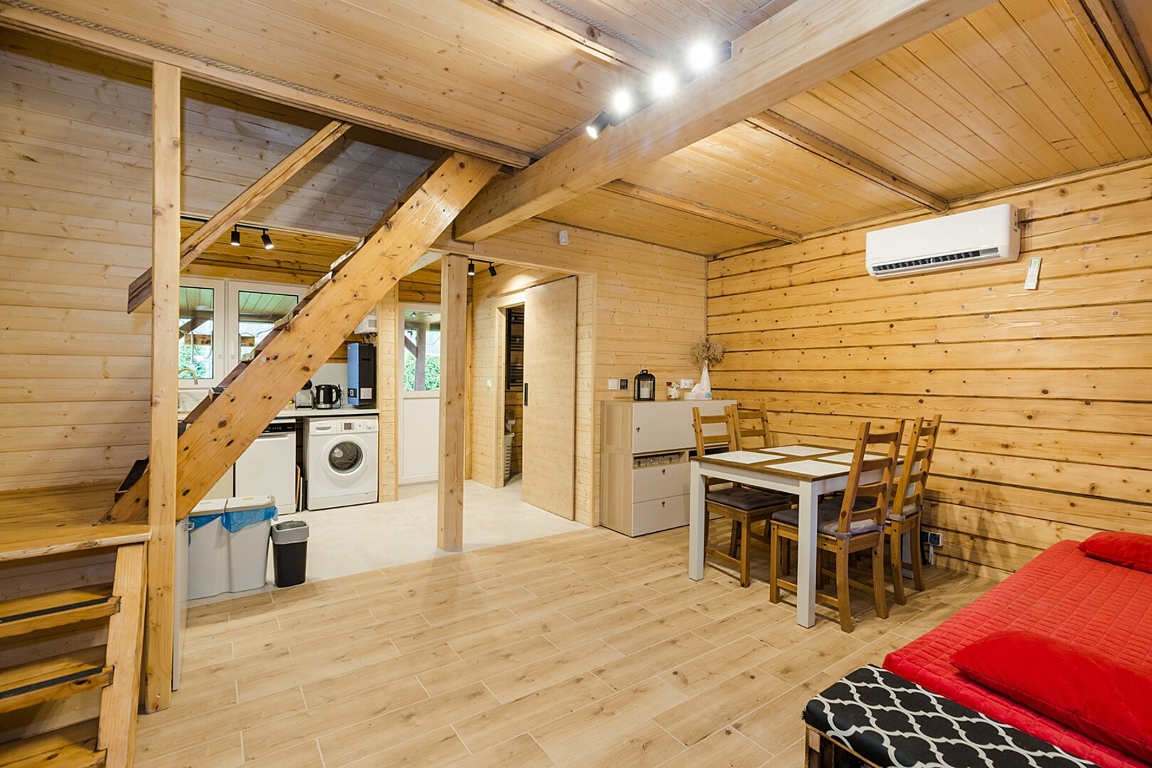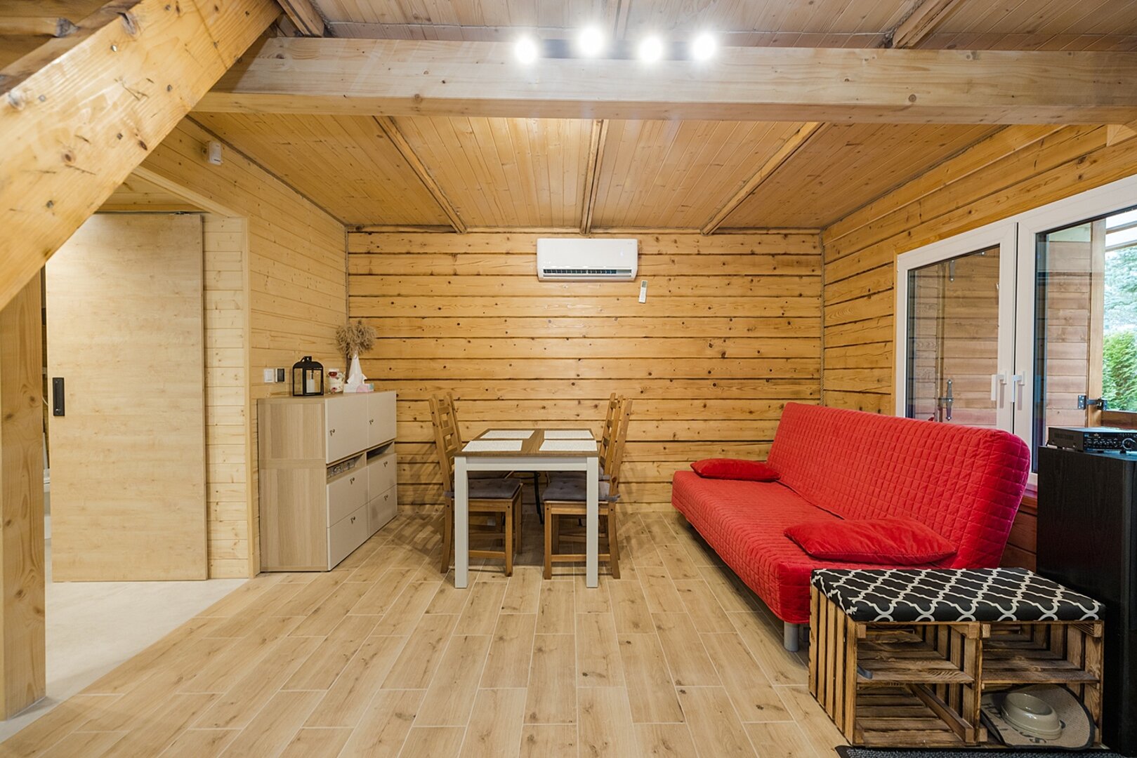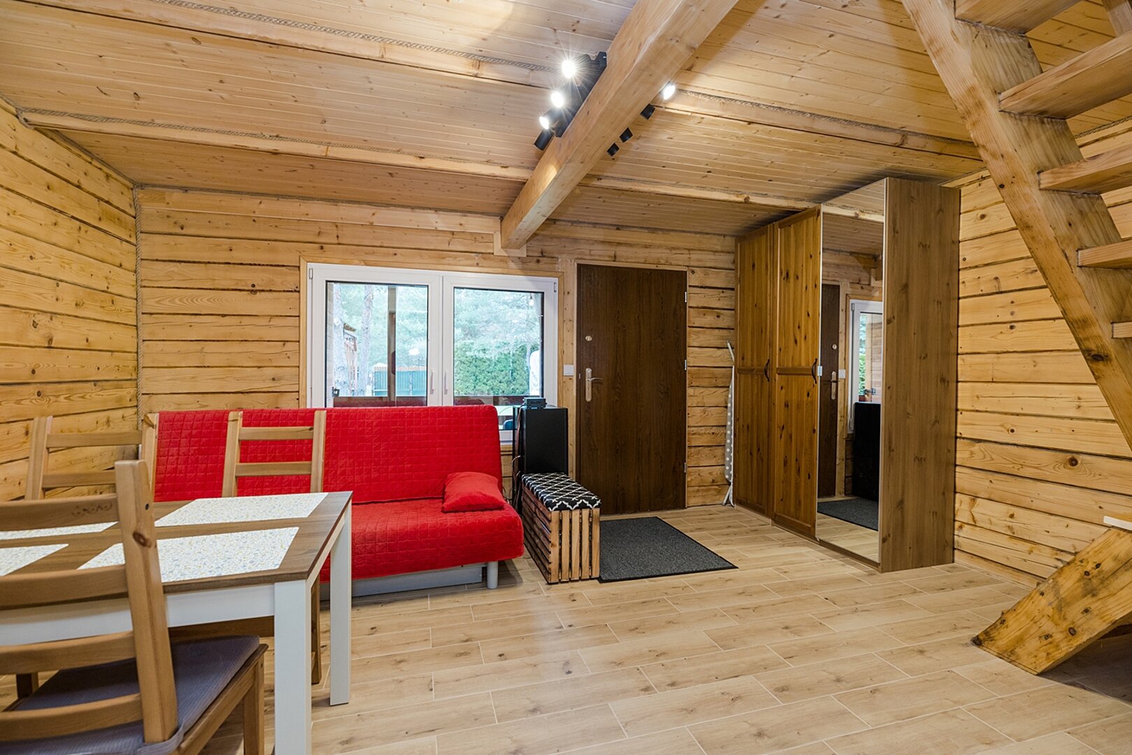 Domek mieści do 6 osób i oferuje przytulny salon z aneksem kuchennym, łazienkę z prysznicem oraz dwie sypialnie na poddaszu. Na gości czeka zadaszony taras, grill gazowy oraz miejsce na ognisko. Obiekt jest w pełni wyposażony – posiada klimatyzację, ogrzewanie podłogowe, Wi-Fi i prywatny parking.