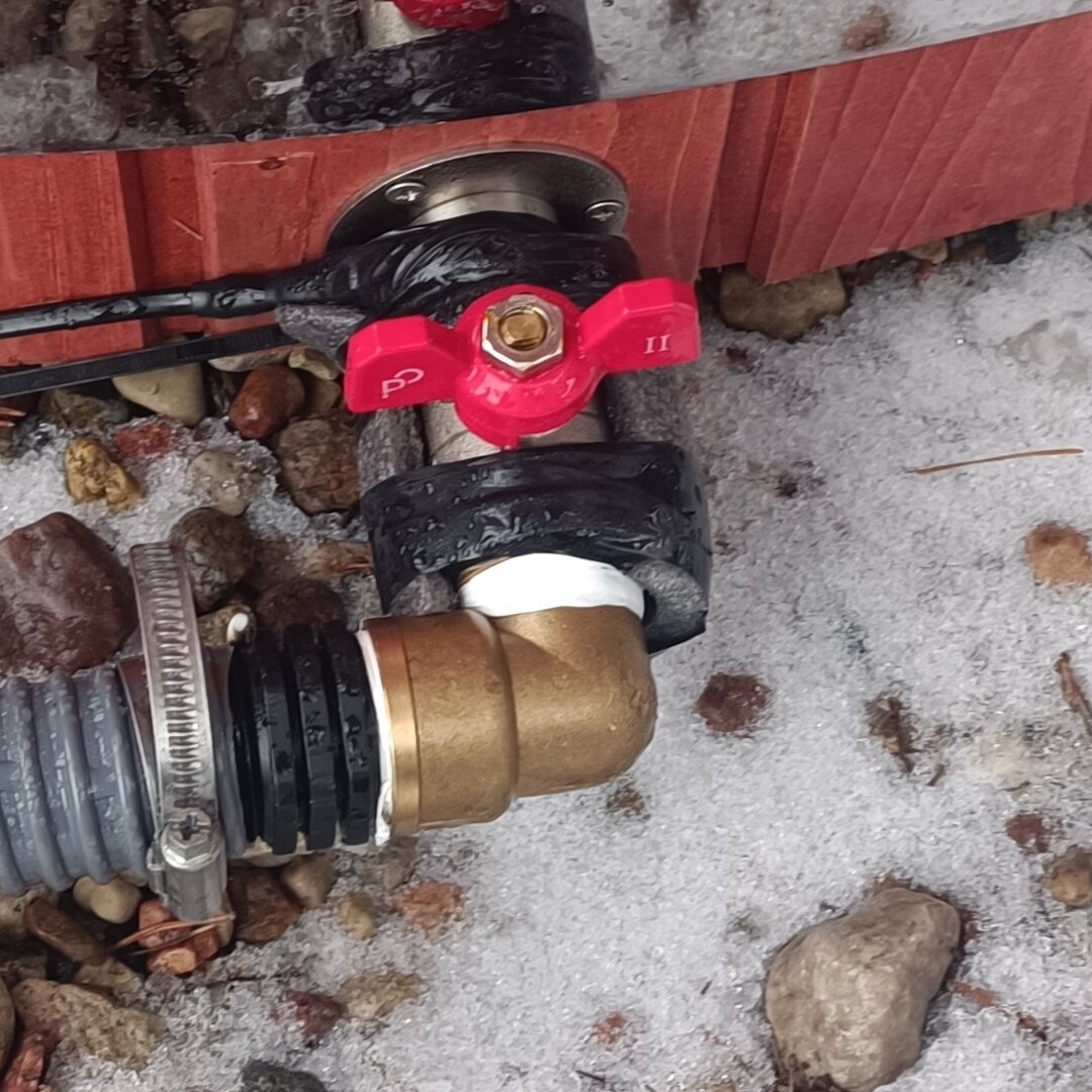 Przy napełnianiu upewnij się, że zawory są w pozycji zamkniętej (w pozycji jak na zdjęciu). Balię napełnij wodą do ok. 4/5 wysokości.